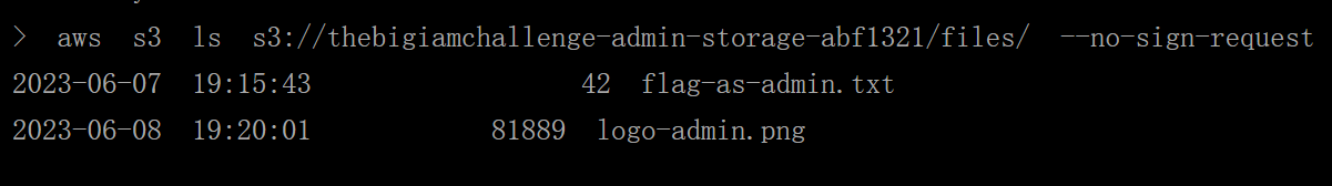 aws s3 ls s3://thebigiamchallenge-admin-storage-abf1321/files/ --no-sign-request